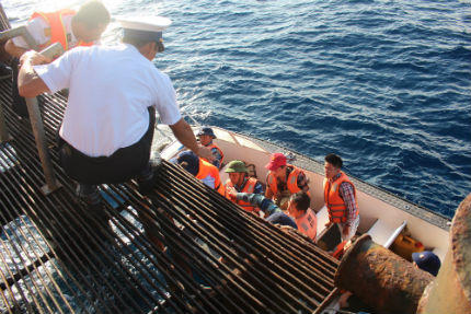 Nhìn những thủy thủ căng thẳng cao độ quan sát từng động tác ngập ngừng của các thành viên đoàn công tác, những tiếng hô “Không được”, “Khẩn trương lên”, “Bước nhanh”… vang lên giữa tiếng sóng ầm ào, không ai không khỏi lo lắng. Chiếc xuồng chở đoàn công tác cứ dập dềnh mãi ở chân cái thang sắt dựng thẳng đứng từ mép nước dẫn lên Nhà giàn. Chỉ cần một tích tắc sơ sảy, hậu quả sẽ vô cùng khó lường, chí ít thì cũng bị xuồng dập cho gãy chân, nặng thì mất mạng như chơi. Nhiều người, phần vì chưa có kinh nghiệm, phần vì quá sợ, không sao tìm được thời điểm xuồng được sóng đẩy lên cao nhất để leo lên Nhà giàn.