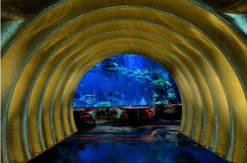 Nhà hàng Subsix tại khu resort Per Aquum, Maldives với diện tích 500 mét vuông và sâu 6 mét dưới mặt nước biển. Nhà hàng phục vụ các món ăn tươi như cua bể, bò Kobe, tôm hùm...