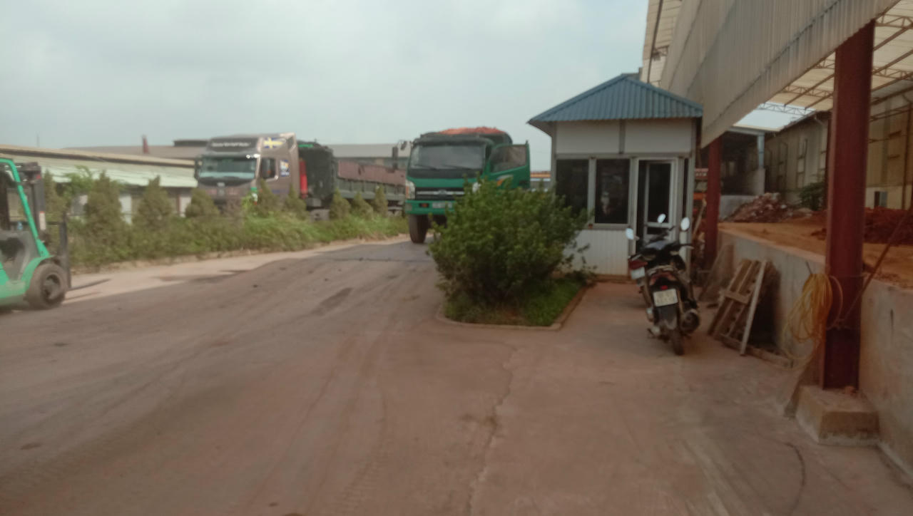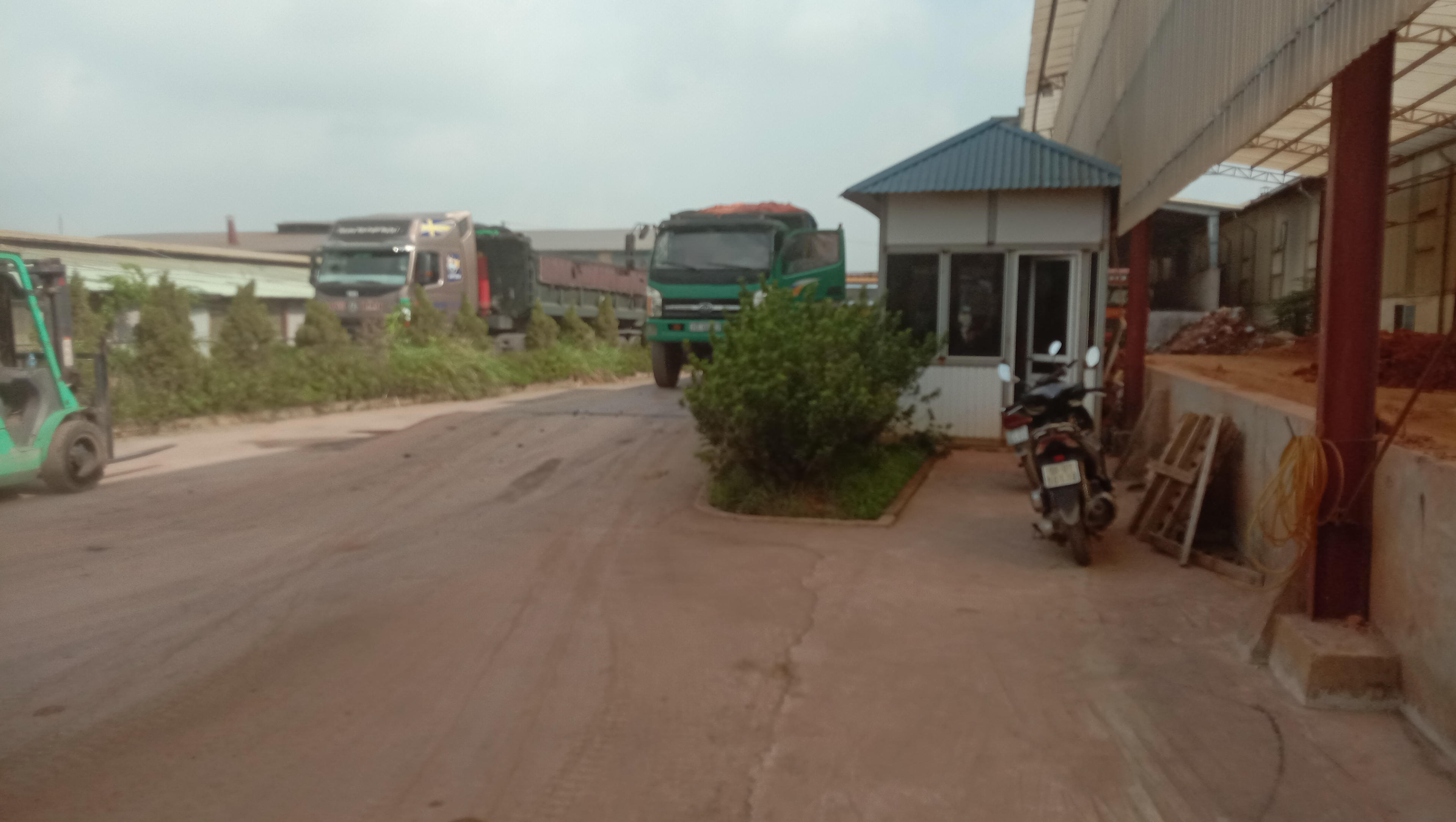 Sau khi cân trọng tải, đất được chuyển đến bãi tập kết nằm phía sau của nhà máy. Tại đây đã có 4 công nhân chờ sẵn với một chiếc máy ủi, một máy xúc hỗ trợ san gạt để đưa đất vào máy nghiền.