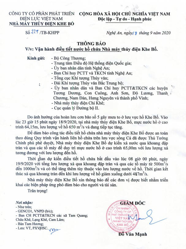 Sau khi nhận được thông tin các nhà máy thủy điện xả lũ, UBND các huyện Tương Dương, Con Cuông đã thông báo cho các xã tuyên truyền cho người dân biết để chủ động ứng phó đảm bảo cho người và tài sản.
