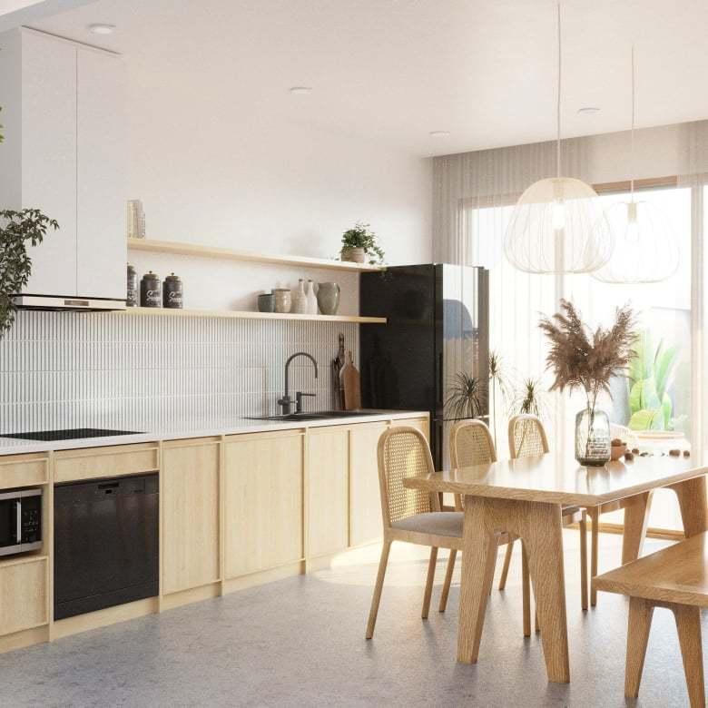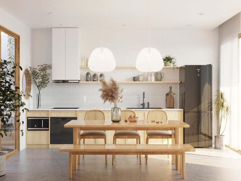 Bếp tối giản, không dùng hệ tủ kịch trần cho không gian rộng mở.
