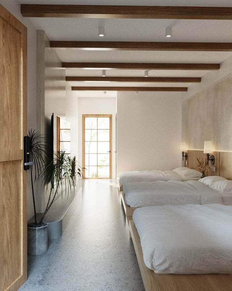 Tầng 1 là phòng ngủ tập thể nên nhóm kiến trúc sư bố trí giường dạng sập gỗ trải dài có thể ngủ được nhiều người với màu gỗ sáng, có thể bố trí được 3 đệm đôi dành cho 6 người.