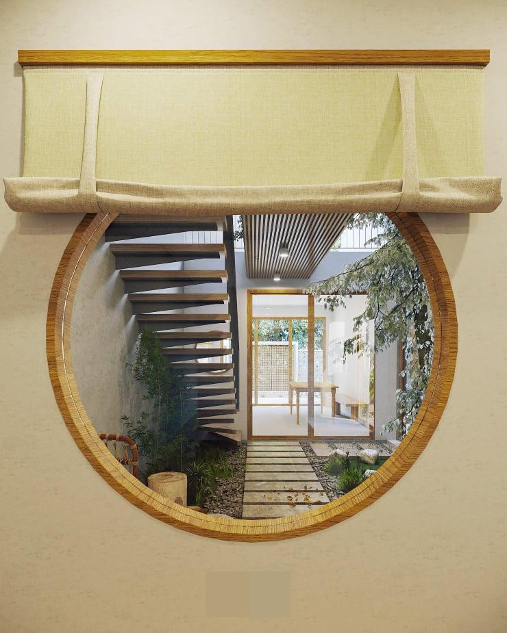Điểm nhấn của phòng là cửa sổ tròn nhìn ra khoảng sân vườn thông tầng giữa nhà.