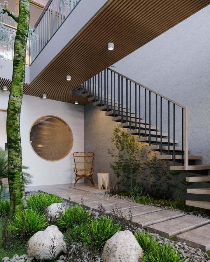 Giếng trời được trồng cây Bàng Đài Loan giúp mang sức sống đến ngôi nhà nhiều hơn. Đồng thời là nơi lấy ánh sáng cho nhà, cũng là nơi thư giãn, uống trà và lọc không khí cho môi trường.