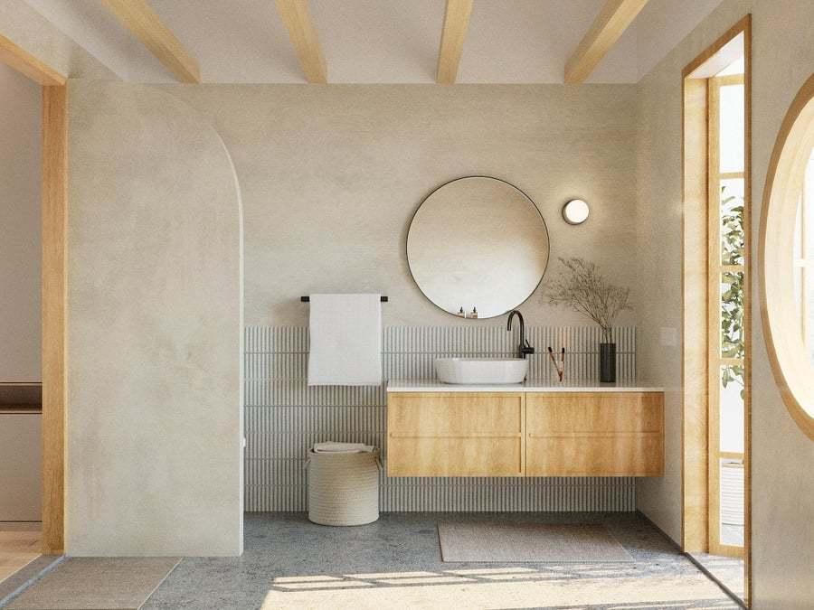 Phòng vệ sinh tầng 1 sử dụng chung nên sẽ có công năng cơ bản và vật liệu sàn bê tông mài, tường sơn giả bê tông màu đất chống ẩm.