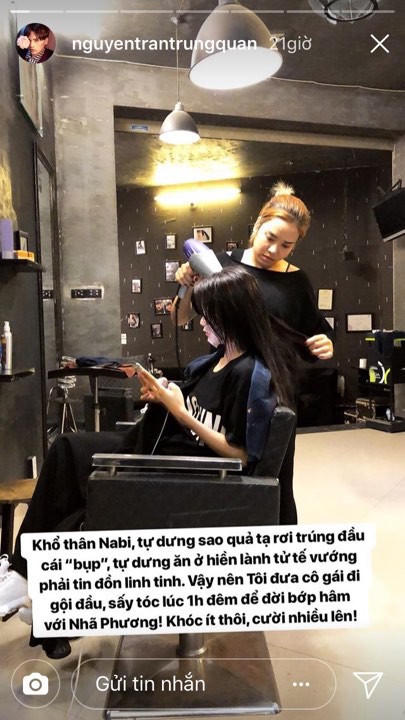 Trong bức ảnh đầu tiên, Trung Quân viết: "Khổ thân Nabi, tưng dưng sao quả tạ rơi trúng đầu cái "bụp", tự dưng ăn ở hiền lành tử tế vướng phải tin đồn linh tinh. Vậy nên tôi đưa cô gái đi gội đầu, sấy tóc lúc 1h đêm để đời bớt hâm với Nhã Phương. Khóc ít thôi, cười nhiều lên".