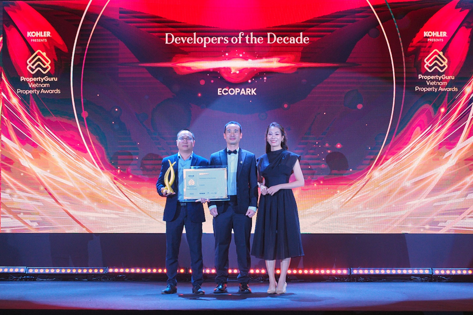 (PLVN) - Nhà sáng lập Ecopark vừa được vinh danh ở hạng mục Chủ đầu tư của thập kỉ do BTC Giải thưởng Bất động sản Việt Nam PropertyGuru trao tặng. Riêng dự án Ecovillage Saigon River- bất động sản Blue Zones đầu tiên tại Việt Nam còn nhận được giải thưởng Dự án có thiết kế cảnh quan đẹp nhất Việt Nam.