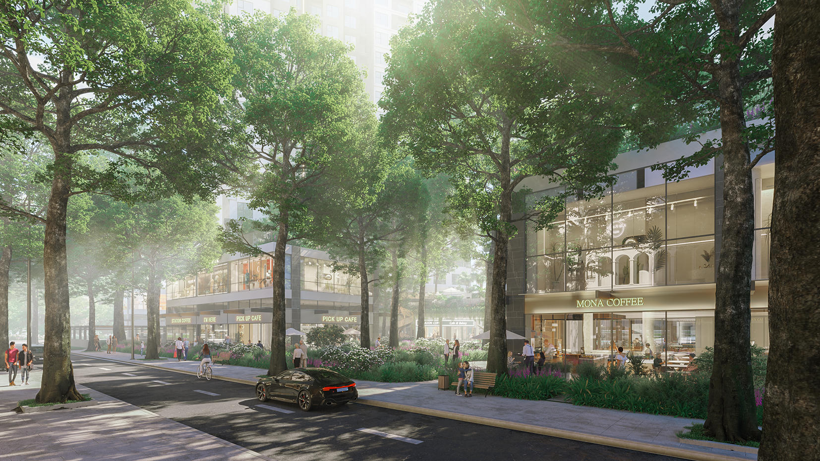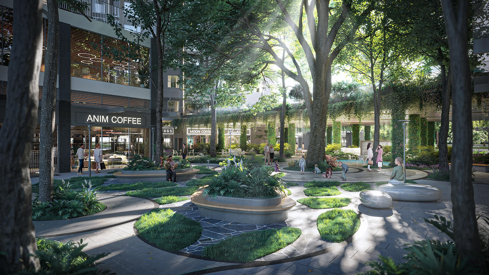 Dưới chân 2 tòa tháp là khối đế thương mại cao 2 tầng. Với concept “shopping giữa rừng”, việc mua sắm tại đây sẽ đem đến cho cư dân trải nghiệm hoàn toàn khác biệt. “Nó giống như cuộc dạo chơi dưới chân tòa nhà, dưới những tán cây chứ không đơn thuần là mua sắm. Bởi dưới khối đế này, chúng tôi thiết kế bao quanh nó còn là khu vườn sức khỏe, đường dạo ánh sáng. Đây vừa là không gian mua sắm với các thương hiệu lớn vừa là nơi kết nối cư dân với nhau, cũng là không gian vui đùa của trẻ nhỏ”, đại diện chủ đầu tư chia sẻ.