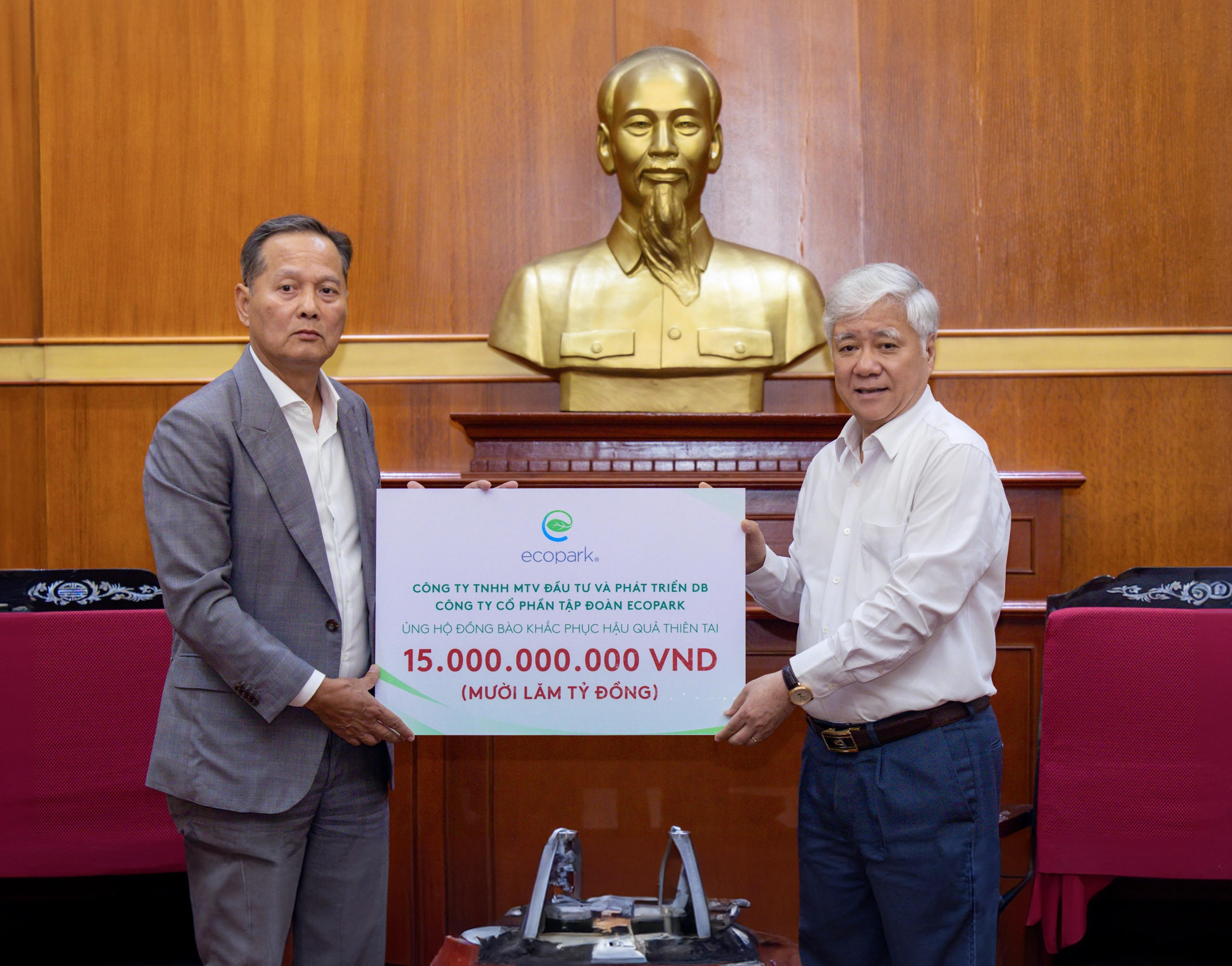 Thông qua Mặt trận Tổ quốc Việt Nam, Nhà sáng lập Ecopark ủng hộ 15 tỷ đồng cho các tỉnh miền Bắc đang gánh chịu ảnh hưởng nặng nề từ bão lũ. Khoản ngân sách được dùng để mua các nhu yếu phẩm thiết yếu trước mắt và phục vụ công tác khắc phục hậu quả của bão cho đồng bào vùng bị ảnh hưởng nặng bởi thiên tai.