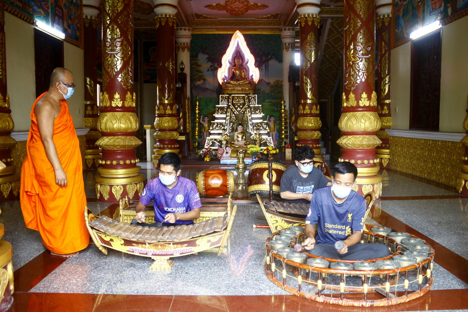 Thượng tọa Lý Hùng hướng dẫn sinh viên chơi nhạc ngũ âm |