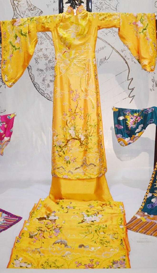 Nhà thiết kế Lan Hương đã đưa những họa tiết trang trí những bức tranh tứ quý, những linh vật lên thân áo... Chất liệu vải là lụa tơ tằm kết hợp với màu vàng cung đình và kiểu dáng cũng thiên về áo dài cung đình. Tấm áo dài này được 45 thợ thêu tay cầu kỳ thực hiện ròng rã gần 300 ngày.