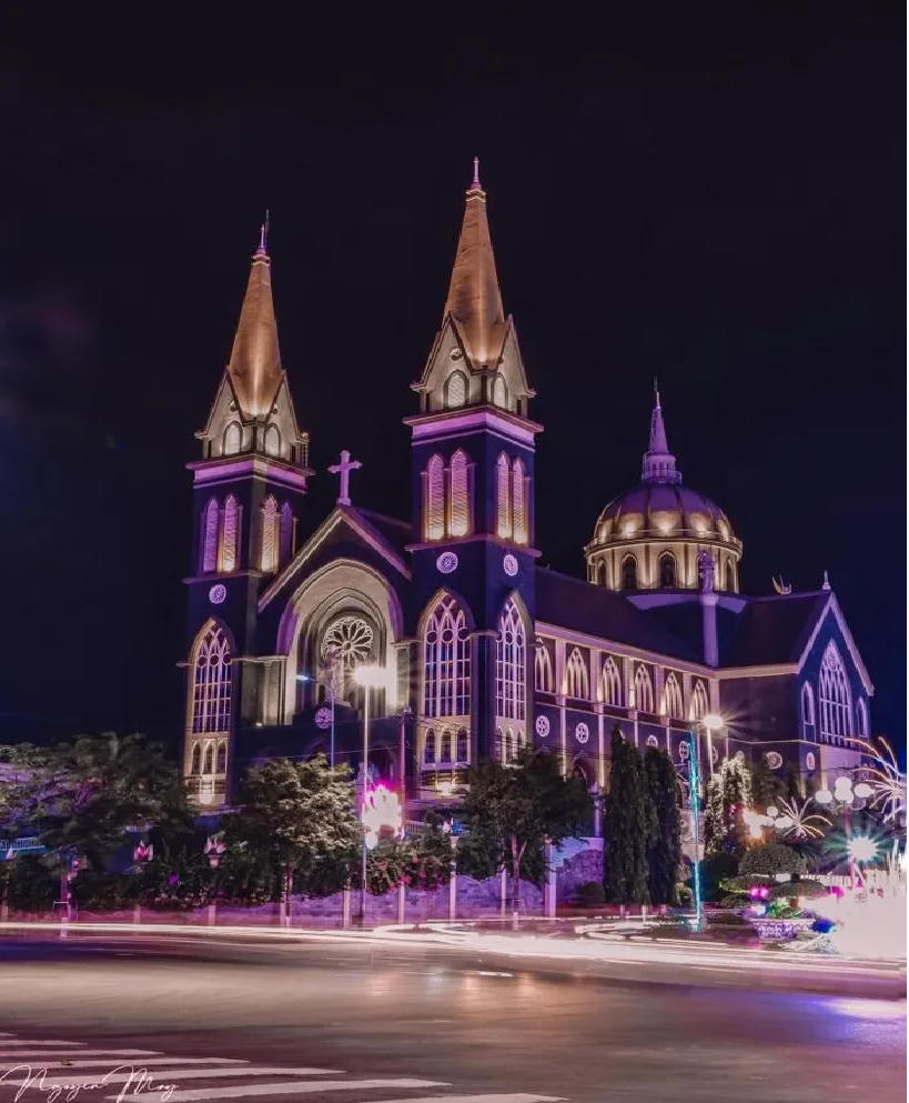 Nhà thờ Phú Cường hiện lên như một tòa lâu đài lung linh khi đêm về. (Ảnh: Nguyễn May) |
