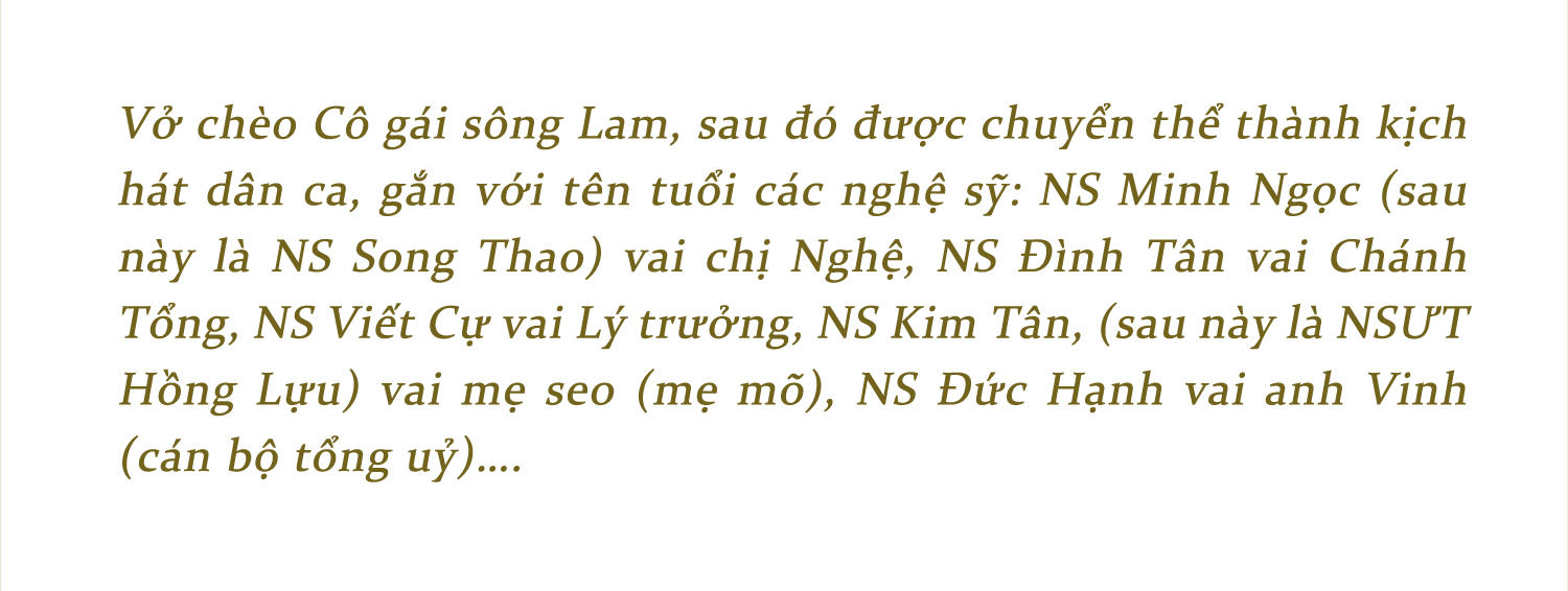 Nghệ sỹ Kim Tân – người đóng vai mẹ mõ trong vở chèo Cô gái sông Lam lừng danh năm xưa, ngày ấy mới mười tám, đôi mươi, nay đã sang tuổi 75. Vẫn không nguôi xúc động, bà kể về những năm tháng đầy vinh quang và kỷ niệm với lần Đoàn chèo được vào diễn cho Bác Hồ xem: “Có thể nói vở diễn của anh Trung Phong đã đưa tôi tới với vinh quang nghiệp diễn khi tôi mới chỉ là một thiếu nữ, chưa có nhiều kinh nghiệm diễn xuất, chưa được học bài bản qua trường lớp diễn xuất nào. Chúng tôi đã diễn với tất cả những gì chân thật, hồn nhiên, diễn bằng bản năng, bằng cảm xúc dẫn lối. Tôi không thể ngờ, chỉ với 2 màn ra sân khấu ngắn ngủi, nhưng với vai mõ- vài hài hước đầu tiên và hiếm hoi của nghiệp diễn đời mình- tôi đã giành được Huy chương Bạc tại Hội diễn sân khấu toàn quốc năm ấy. Ngày ấy, anh Mai Vy là thứ trưởng Bộ Văn hóa, sau hội diễn đã thân mật gọi tôi là “cô Mõ Nghệ An”. Tôi đi đến đâu, kể cả đi tàu Vinh – Hà Nội, người ta cũng nhận ra tôi và gọi tôi: Mẹ Mõ kìa!