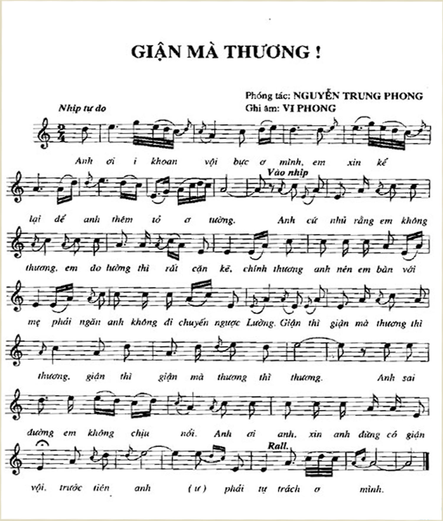 Nhạc sỹ Thanh Lưu chia sẻ thêm: “Nguyễn Trung Phong không phải là một nhạc sỹ sáng tác, anh không thông tỏ nhạc lý, nhưng nhờ sự nhạy cảm của một nghệ sĩ sân khấu, lại tích luỹ được nhiều vốn liếng dân ca – chèo, cho nên anh đã sáng tạo bài hát bằng phương pháp lồng ghép chắp điệu mà dân gian thường dùng, nối ví sang giặm hết sức nhuần nhuyễn, giống như kiểu ngâm vỉa (hoặc sử) rồi bắc cầu sang hát ở trong chèo. Dĩ nhiên khi liên kết giữa ví và gặm, anh đã có sự cải biên bằng thủ pháp mô phỏng mô tiến, điệp khúc điệp từ, nhấn âm hình chủ đạo, giữ âm sắc đặc trưng, nghe rất “Nghệ” rất dân gian mà cũng rất hiện đại, vừa giàu sức truyền cảm vừa mang tính đa dùng. Có thể nói bài hát “Giận mà thương” là một trong những bài cải biên sân khấu hoá dân ca Nghệ Tĩnh thành công nhất từ trước tới nay.