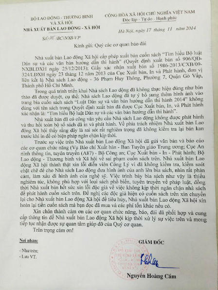 Việc trình bày bìa sách như vậy là thiếu nghiêm túc, không phù hợp với loại sách phổ biến, tuyên truyền về pháp luật, đồng thời Nhà xuất bản hết sức xin lỗi độc giả về việc không kịp thời ngăn chặn nhà sách để phát hành cuốn sách trên. Đề nghị các độc giả hiện có cuốn sách trên xin chuyển lại cho Nhà xuất bản Lao động Xã hội để tiêu hủy, Nhà xuất bản Lao động Xã hội xin hoàn lại tiền cuốn sách mà bạn đọc đã mua và các phí tổn khác nếu có.