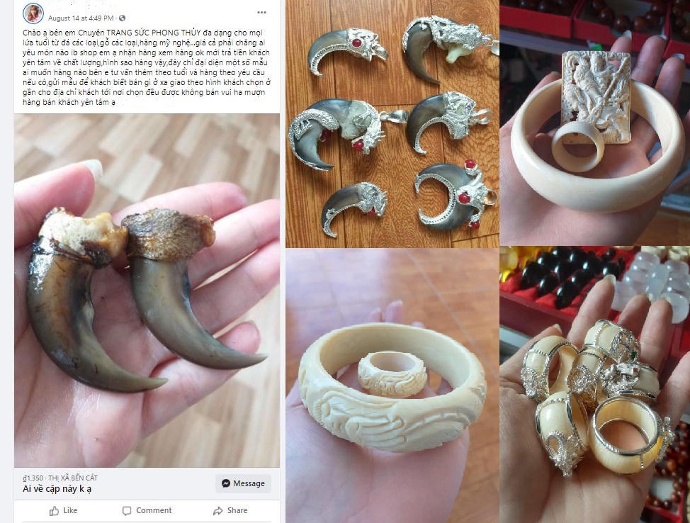 Theo ghi nhận tại Cơ sở dữ liệu vi phạm về động vật hoang dã của Trung tâm Giáo dục Thiên nhiên (ENV), từ đầu năm 2021 cho tới khi bị bắt giữ, đối tượng Huỳnh Thị Thanh Hằng thường xuyên sử dụng nhiều tài khoản khác nhau trên mạng xã hội Facebook để quảng cáo và buôn bán các sản phẩm động vật hoang dã nguy cấp, quý, hiếm như vòng ngà voi, nhẫn ngà voi, móng gấu.