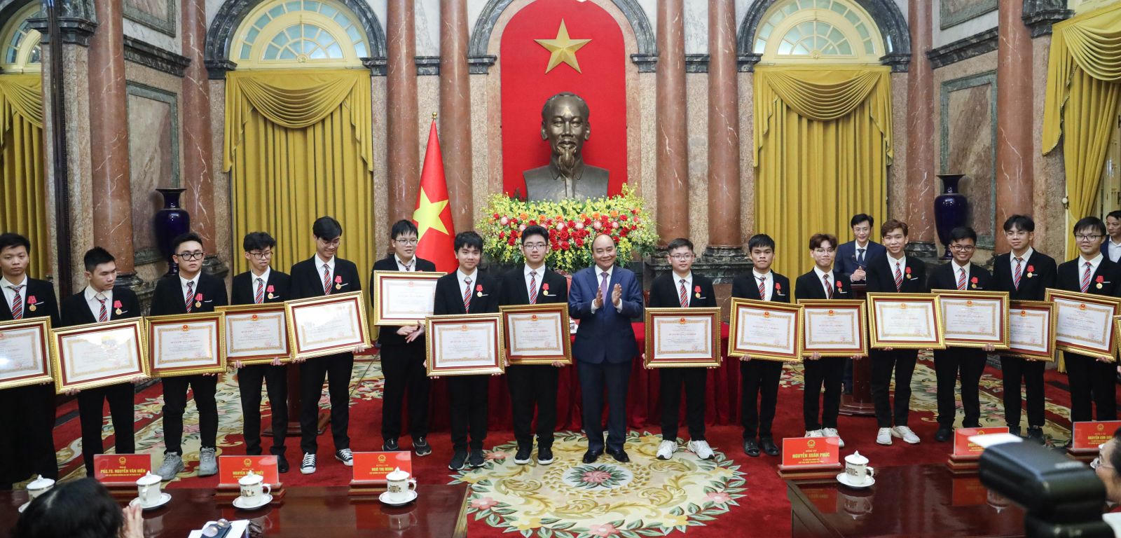 | Chủ tịch nước Nguyễn Xuân Phúc trao tặng Huân chương Lao động hạng Nhì và hạng Ba cho học sinh đoạt giải các cuộc thi Olympic và Khoa học kỹ thuật quốc tế năm 2022. (Ảnh: VPCTN) |
