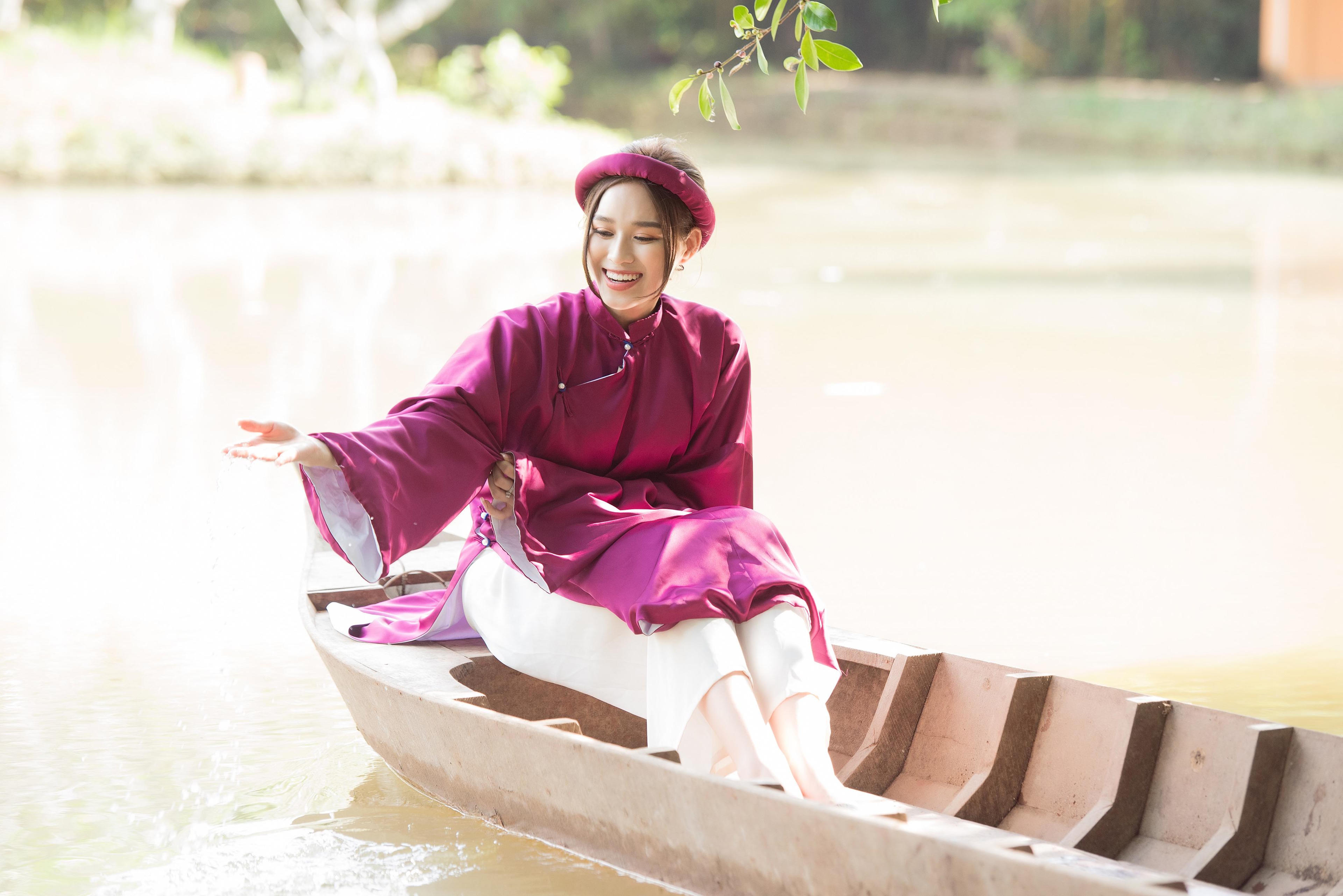 Cô diễn tả niềm tự hào về đất nước không chỉ qua hình ảnh của danh thắng cảnh hùng vĩ, mà còn được thể hiện rõ nét qua tà áo dài thướt tha.