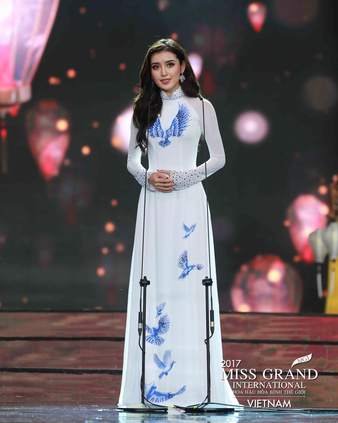 Sau màn trình diễn áo tắm nóng bỏng của top 20, BTC tiếp tục công bố top 10. 10 câu gái xinh đẹp cùng diện áo dài trắng có họa tiết bồ câu - biểu tượng của sự hòa bình để hùng biện về việc chấm dứt chiến tranh.