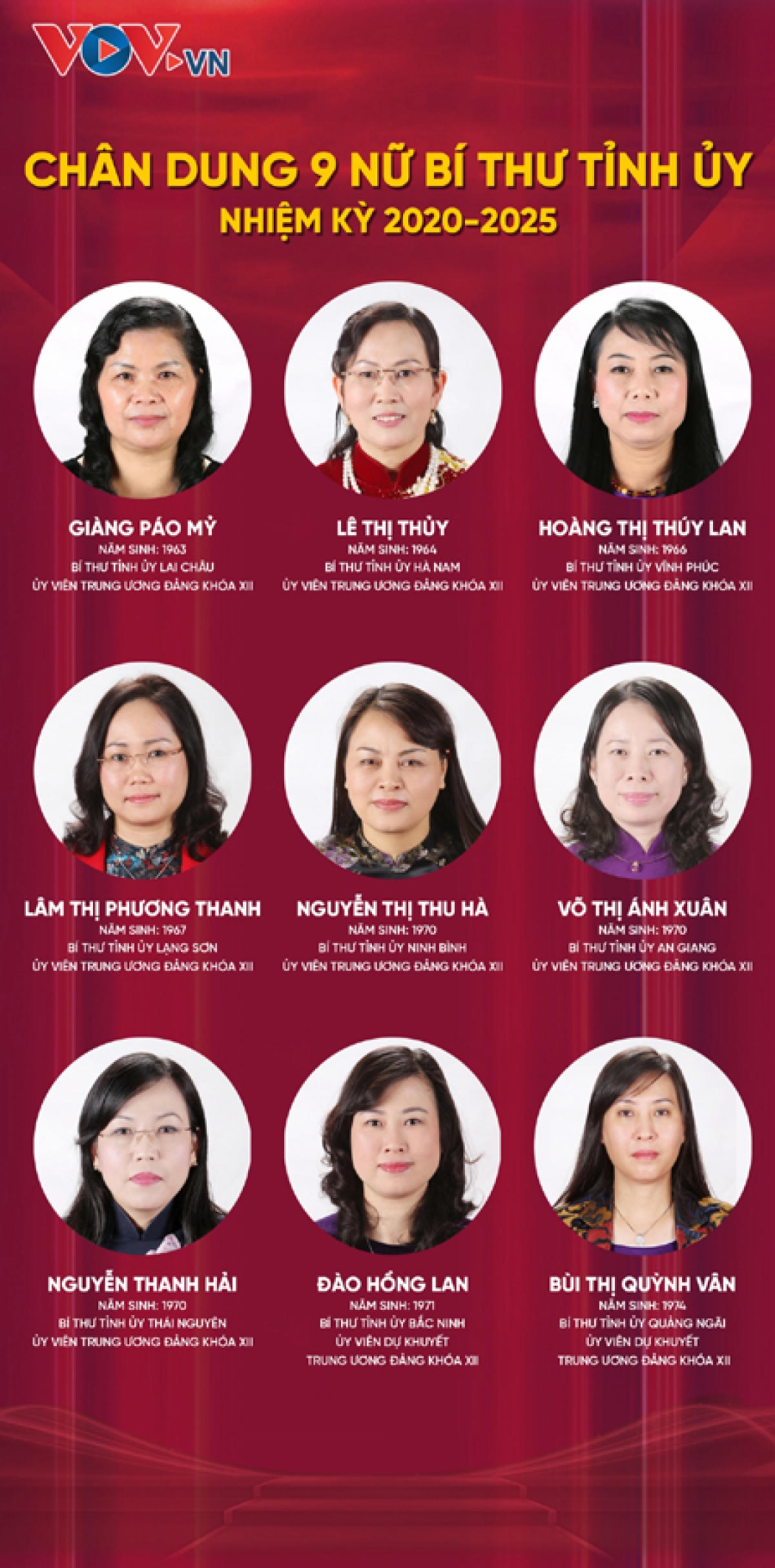 Một chỉ số đặc biệt ấn tượng ở nhiệm kỳ này đó là cơ cấu nữ trong cấp ủy và trong những vị trí chủ chốt. Trong 63 Bí thư Tỉnh ủy, Thành ủy nhiệm kỳ mới có 9 cán bộ nữ. Cụ thể, 9 nữ Bí thư Tỉnh ủy được bầu ở tỉnh Vĩnh Phúc, Thái Nguyên, An Giang, Hà Nam, Lạng Sơn, Quảng Ngãi, Ninh Bình, Lai Châu và Bắc Ninh. Ở nhiệm kỳ trước chỉ có 3 nữ Bí thư Tỉnh ủy.