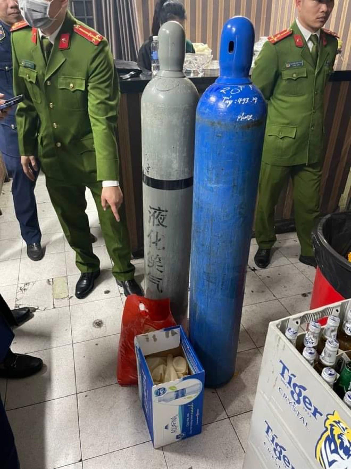 Trước đó, rạng sáng 12/3, Công an quận Hoàn Kiếm phối hợp với Cục Quản lý thị trường Hà Nội bất ngờ kiểm tra quán bar Heyo Club, phát hiện tại khu vực quầy bar của quán có 2 bình khí N2O, 2 thùng vỏ bóng cao su để bơm làm “bóng cười” bán cho khách.