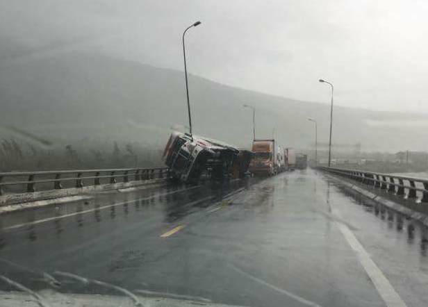Gió vẫn giật liên hồi, xe nào vô tình mở cửa đều bị cơn gió gào thét thổi bay đồ đạc khắp nơi. Gió giật bay nhiều cánh cửa xe. Có xe Container bị thổi nghiêng tưởng rơi xuống cầu. Các tài xế hoảng hốt chỉ còn biết cầu nguyện cho cơn bão qua.