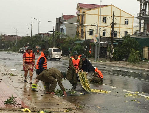 17h, bão đã đi qua Hà Tĩnh, nhưng gió vẫn giật rất mạnh. Các chiến sĩ CSGT vẫn nguyên bộ đồ ướt sũng đang hối hả dọn dẹp vệ sinh giao thông trên toàn tuyến tại thị xã Kỳ Anh, sau cơn tàn phá của bão.