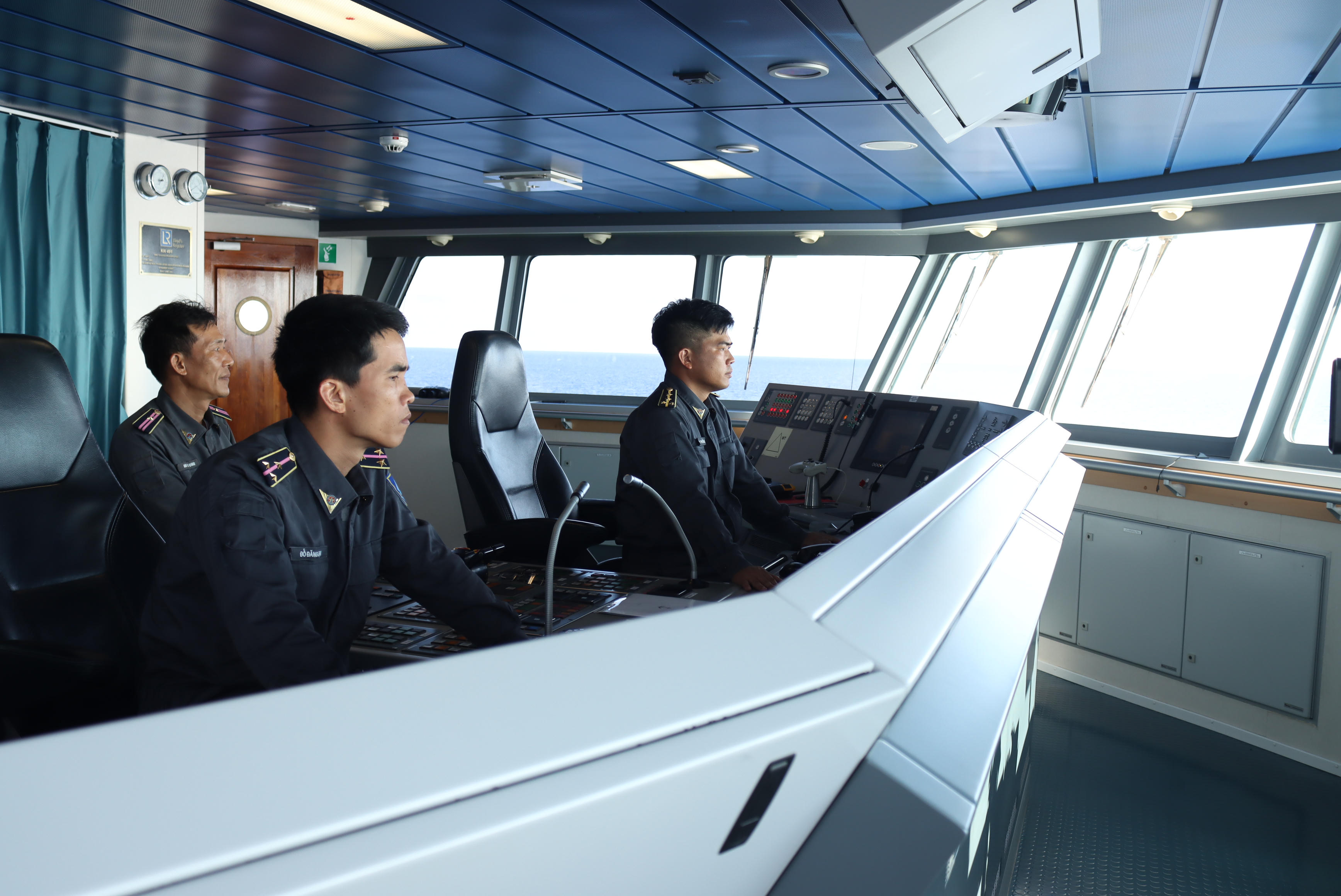 Khi chúng tôi đến, đang là ca trực của anh Phan Văn Trưởng - Phó thuyền trưởng, anh Bùi Hồng Quang - nhân viên Hàng hải và anh Đỗ Đăng Đại - Thủy thủ. Trong lúc đa số đại biểu đang yên giấc ngủ trưa, thì các anh vẫn bám sát vị trí công tác để bảo đảm một hải trình an toàn tuyệt đối cho đoàn.