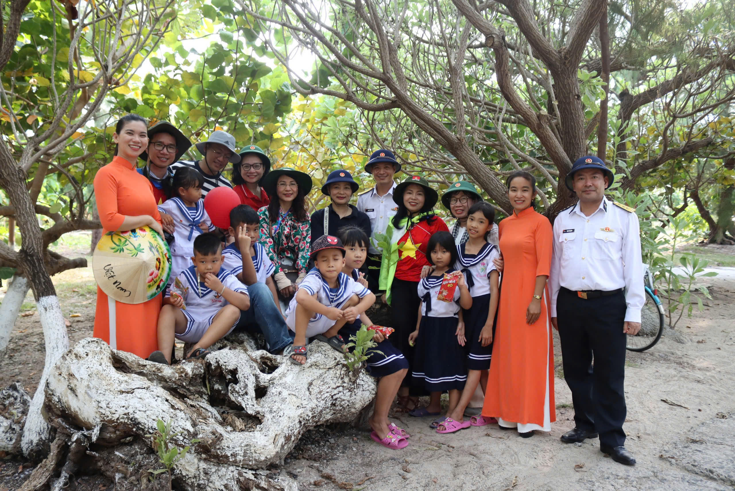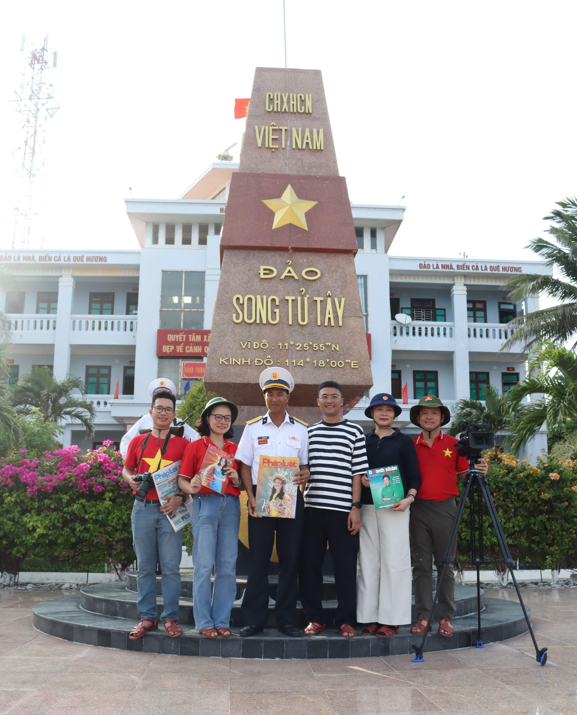 Bà Khương Thị Thanh Huyền - Chủ tịch Công đoàn Bộ Tư pháp, ông Hà Ánh Bình - Phó Tổng biên tập Báo PLVN và các phóng viên Báo PLVN cùng Trung tá Vũ Mạnh Hải, Chỉ huy trưởng đảo Song Tử Tây. |