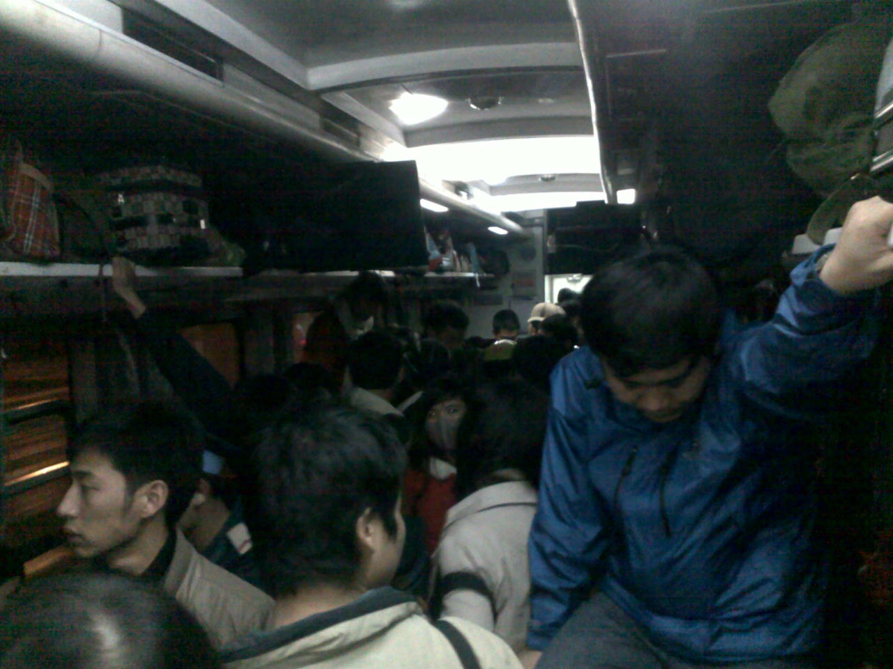 Mà khổ nhất vẫn là cái chuyện đi vệ sinh. Đứng, ngồi cả mấy tiếng đồng hồ, thiếu gì người có nhu cầu. Nhà vệ sinh nếu tính về khoảng cách thì cũng chỉ cách chỗ đứng khoảng chục mét. Nhưng để đi ra được cũng phải chen qua cả đống người đứng, ngồi, nằm la liệt. Ra đến nhà vệ sinh, lại phải xin lỗi mấy người đang ngồi án ngữ đằng trước dịch ra một tí để còn mở cửa. Xong xuôi, thở phào nhẹ nhõm vì phải mất có khi cả nửa tiếng cho cái nhu cầu cá nhân.