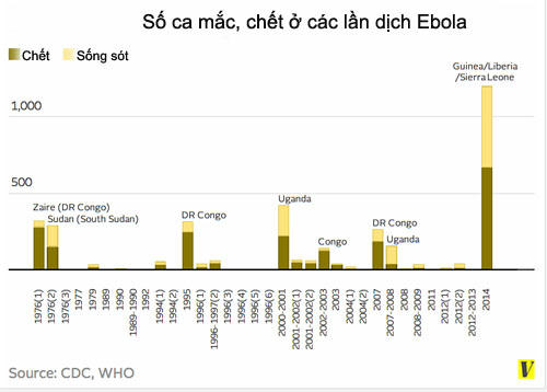 - Năm 1976, số người chết là 280 trong tổng số 138 trường hợp được báo cáo. Năm 2014 đã có 729 người chết trong số 1.323 trường hợp ghi nhận. Như vậy, con số tử vong do Ebola năm 2014 cao gấp hơn 4 lần năm 1976.