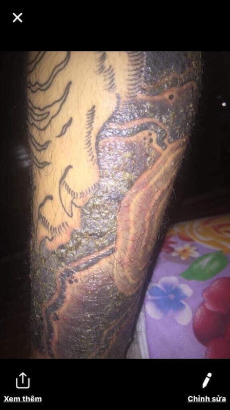 Anh Nguyễn Đăng Trường (Thái Bình) – 1 trong 16 khách hàng bị viêm da sau khi xăm tại cửa hàng ở Đê La Thành chia sẻ: “Sau khi xăm 1 tuần thì vị trí hình xăm ở chân của mình có cảm giác đau rát kèm theo hiện tượng bóc vẩy, sưng tấy, nổi mụn nước, sau đấy thì bưng mủ. Khi chân bị bưng mủ, sưng lên to thì mình không thể đi lại được trong vòng 2 tuần. Lúc đấy, vừa đau vừa lo lắng nên mình đã đến bệnh viện da liễu Thái Bình để khám. Từ đó, mình điều trị bằng việc tiêm kháng sinh và uống thuốc do bác sĩ kê. Hiện tại thì chỗ hình xăm ở chân cũng đỡ, hết tình trạng bưng mủ, mình mong sao chân nhanh khỏi dứt điểm! Và mình cũng mong muốn các cơ quan chức năng sẽ có biện pháp quản lý chặt chẽ hơn, để không còn những loại mực giả, kém chất lượng trên thị trường, để những khách hàng đi xăm như mình dính phải”.