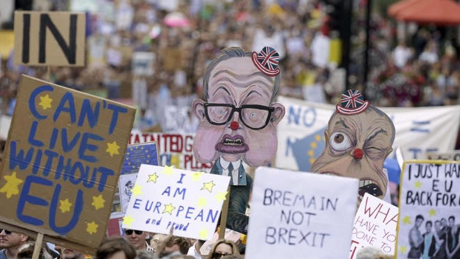 | 9 ngày sau cuộc trưng cầu dân ý Brexit, hàng ngàn người dân Anh tuần hành thể hiện sự gắn bó với Liên Hiệp Châu Âu. |