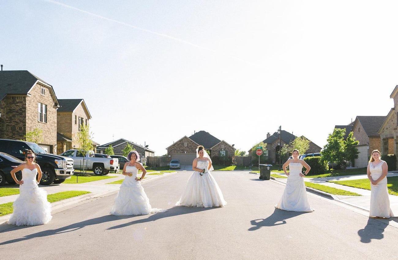 (PLVN) - Elyssa Seibel - nhiếp ảnh gia sống ở bang Texas (Mỹ) đánh bại sự nhàm chán khi ở nhà vì đại dịch Covid - 19 bằng cách chụp ảnh "kiểu cách ly xã hội" cho 5 cô hàng xóm với váy cưới..