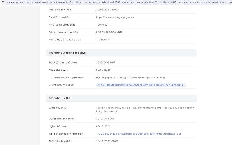 Theo thông báo trên Mạng đấu thầu Quốc gia, vào thời điểm lúc 8h08’ ngày 14/11/2023, Công ty CP Nhiệt điện Hải Phòng đã tiến hành hủy thầu đối với gói thầu cung cấp than cám 6a.14 theo Quyết định số 7812/QĐ-NĐHP ngày 09/11/2023. Lý do hủy thầu được Công ty CP Nhiệt điện Hải Phòng đưa ra là do tất cả hồ sơ dự thầu, hồ sơ đề xuất không đáp ứng được các yêu cầu của hồ sơ mời thầu, hồ sơ yêu cầu.