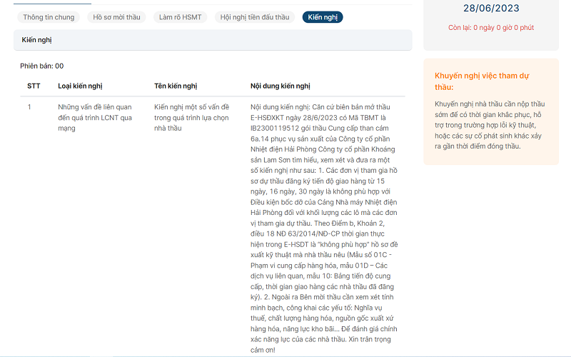 Ngay khi buổi đóng, mở thầu được diễn ra vào ngày 28/6/2023, đã có tổng cộng 7 nhà thầu tham dự đấu thầu. Tuy nhiên, cũng trong ngày 28/6/2023, Công ty cổ phần khoáng sản Lam Sơn (địa chỉ: SN 29, tổ 2, khu 4, phường Ba Đình, TX. Bỉm Sơn, tỉnh Thanh Hoá) đã có kiến nghị trực tiếp với bên mời thầu là Công ty CP Nhiệt điện Hải Phòng liên quan đến quá trình lựa chọn nhà thầu: “Căn cứ biên bản mở thầu E- HSĐXKT ngày 28/6/2023 có Mã TBMT là IB2300119512 gói thầu Cung cấp than cám 6a.14 phục vụ sản xuất của Công ty cổ phần Nhiệt điện Hải Phòng. Các đơn vị tham gia hồ sơ dự thầu đăng ký tiến độ giao hàng từ 15 ngày, 16 ngày, 30 ngày là không phù hợp với Điều kiện bốc dỡ của Cảng Nhà máy Nhiệt điện Hải Phòng đối với khối lượng các lô mà các đơn vị tham gia dự thầu.