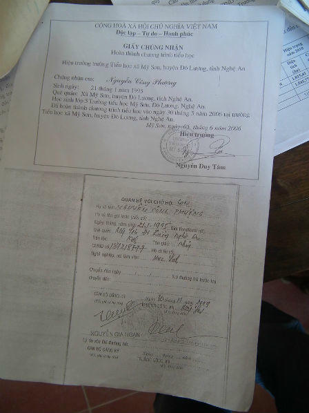 | Trong Giấy chứng nhận hoàn thành chương trình tiểu học của Trường Tiểu học xã Mỹ Sơn, năm sinh của Công Phượng cũng là 1995. |