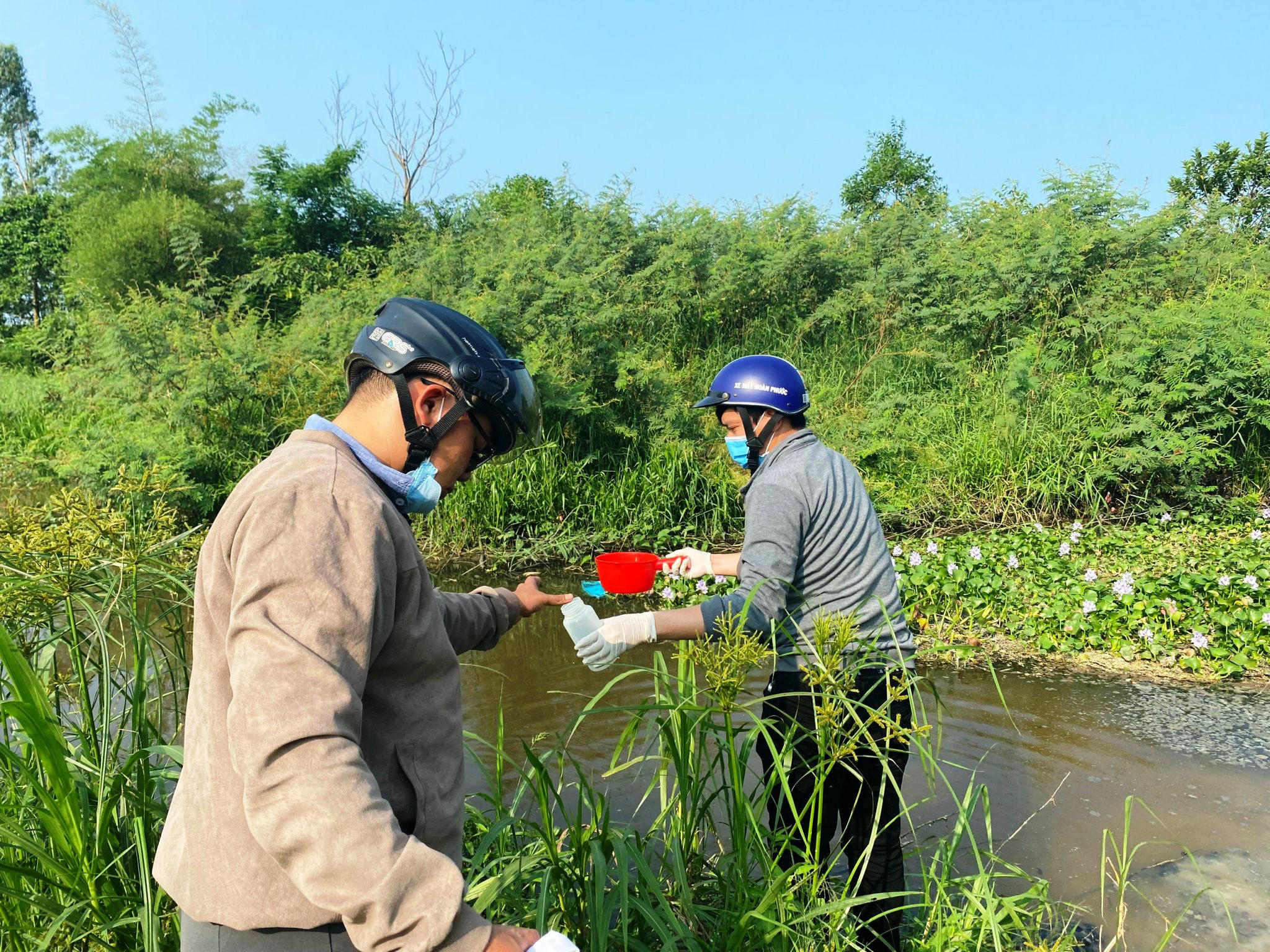 Lấy mẫu nước thải bị ô nhiễm nặng tại một nhánh kênh mương gần CCN làng nghề Tịnh Ấn Tây. |