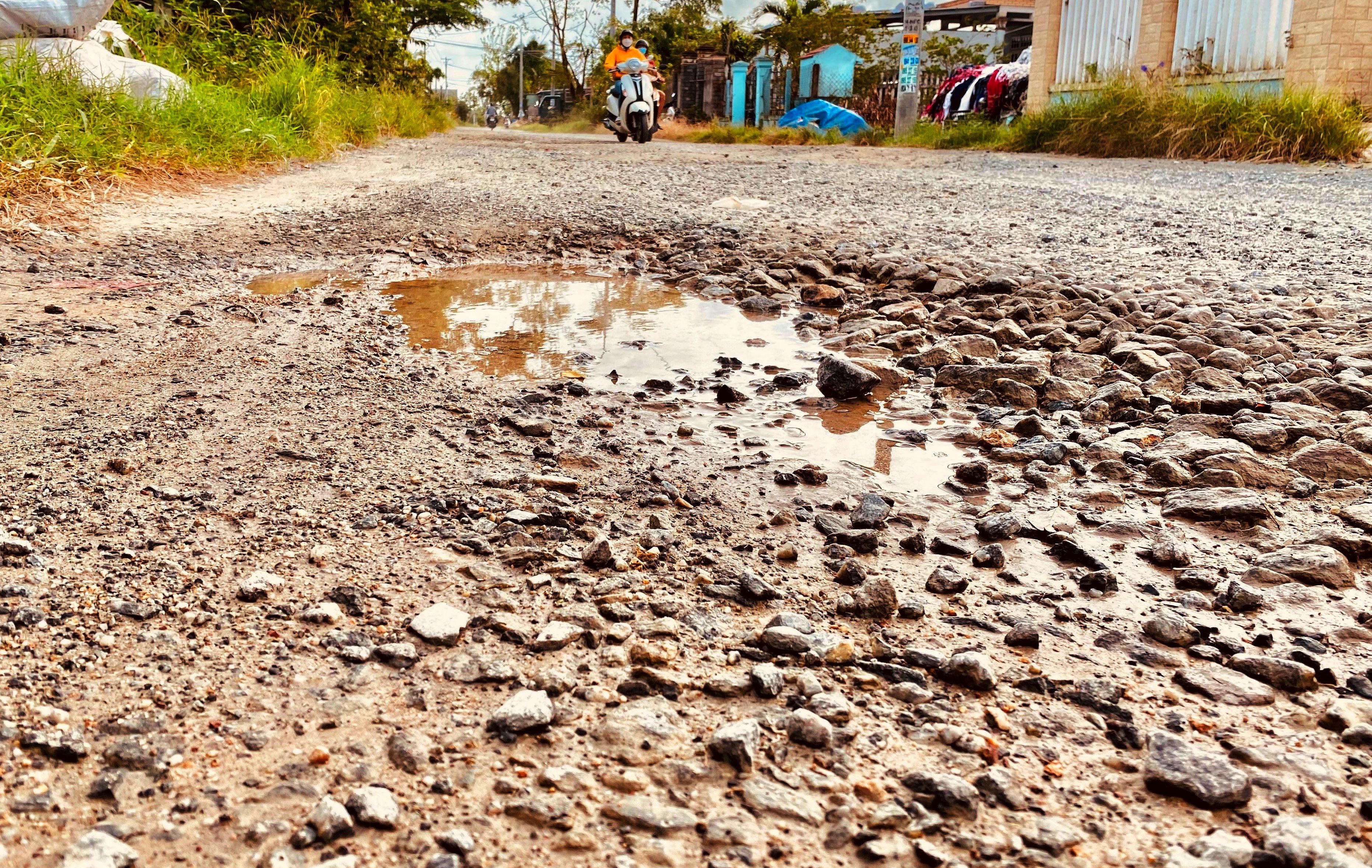 Hiện có khoảng 1,2 km của tuyến đường với vô số “ổ gà”, “ổ voi” xuất hiện. Nhiều đoạn lởm chởm đá do người dân tự bỏ thời gian, công sức ra vá mặt đường. Đặc biệt, việc đất cát rơi vương vãi, tung bụi bay mịt mù làm bầu không khí ô nhiễm.
