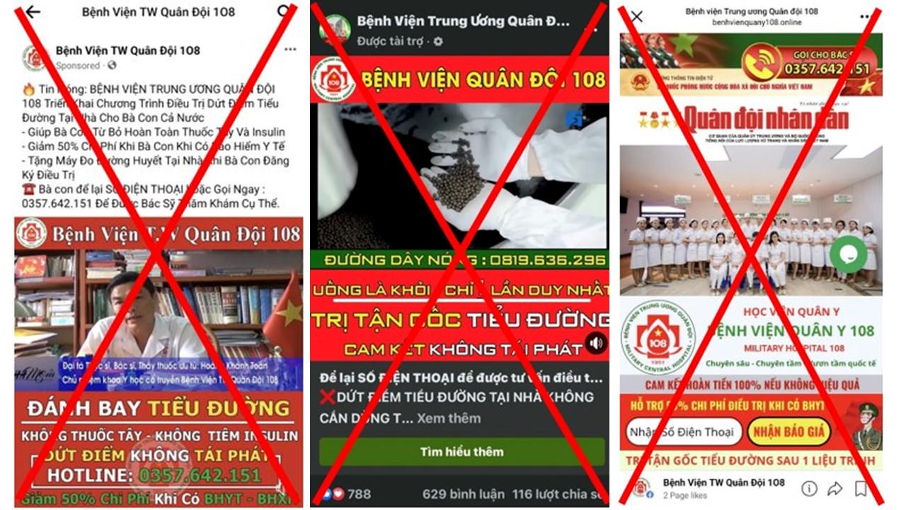 Các thủ đoạn lừa đảo ‘nâng cấp’ liên tục. Từ lập tên trang mạo danh lập lờ dễ gây hiểu nhầm như “Bệnh viện 108”, “Bệnh viện Quân y 108, “Bệnh viện Quân đội 108”… đến thực hiện sao chép, đăng tải trái phép các bài đăng, logo, slogan trên Fanpage chính thức của Bệnh viện TWQĐ 108; thậm chí, cắt ghép hình ảnh, video về Bệnh viện trên các kênh thông tin đại chúng và lồng tiếng quảng cáo sản phẩm hòng lôi kéo người theo dõi.