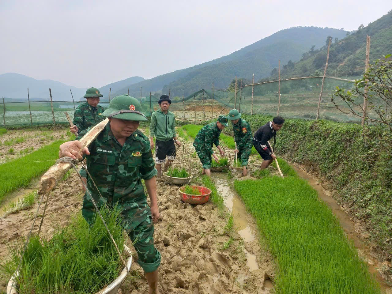 Bộ đội Biên phòng Hà Tĩnh cắm bản hướng dẫn, giúp đỡ bà con dân tộc Chứt canh tác trồng lúa nước. Ảnh: PV |