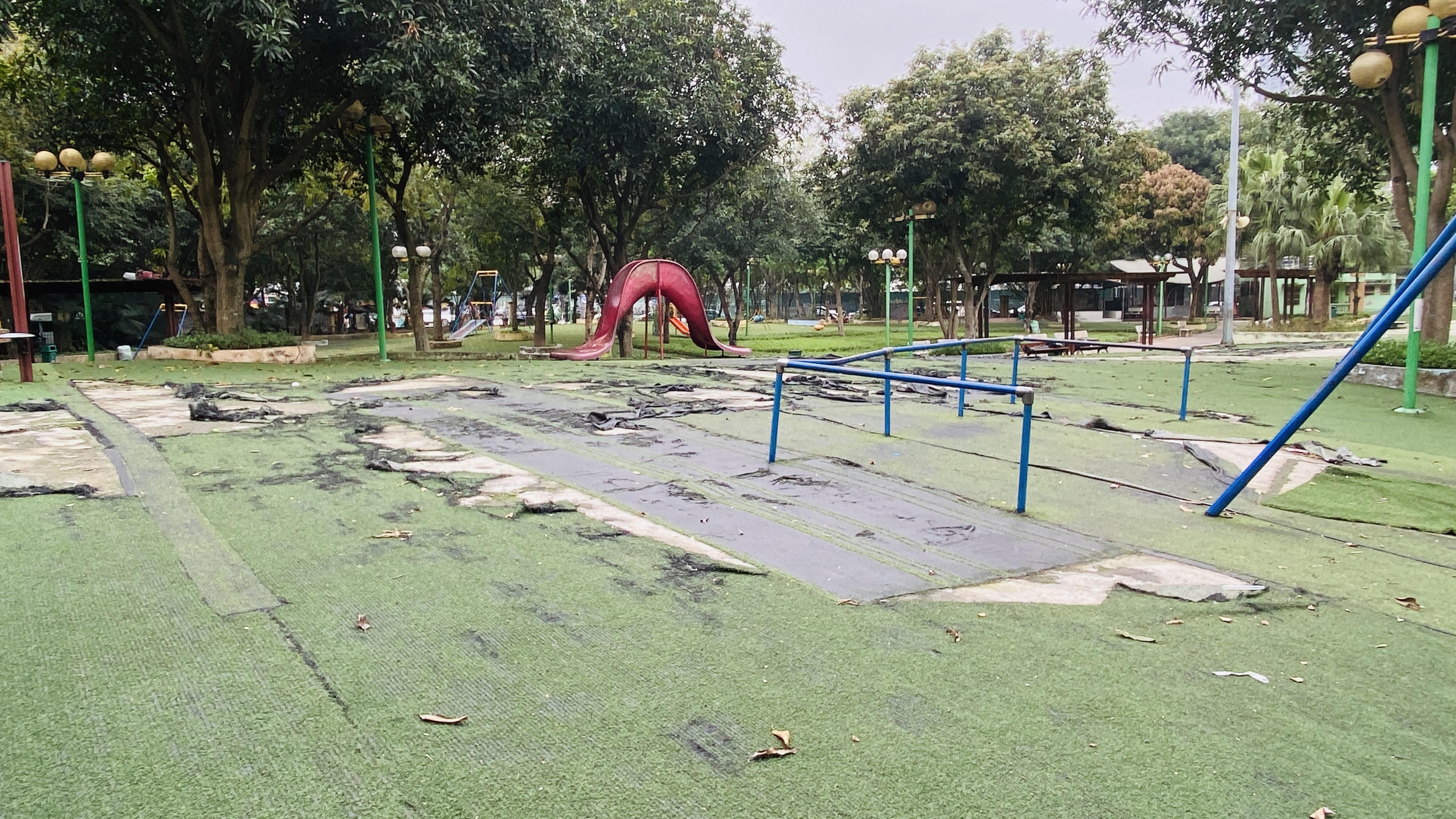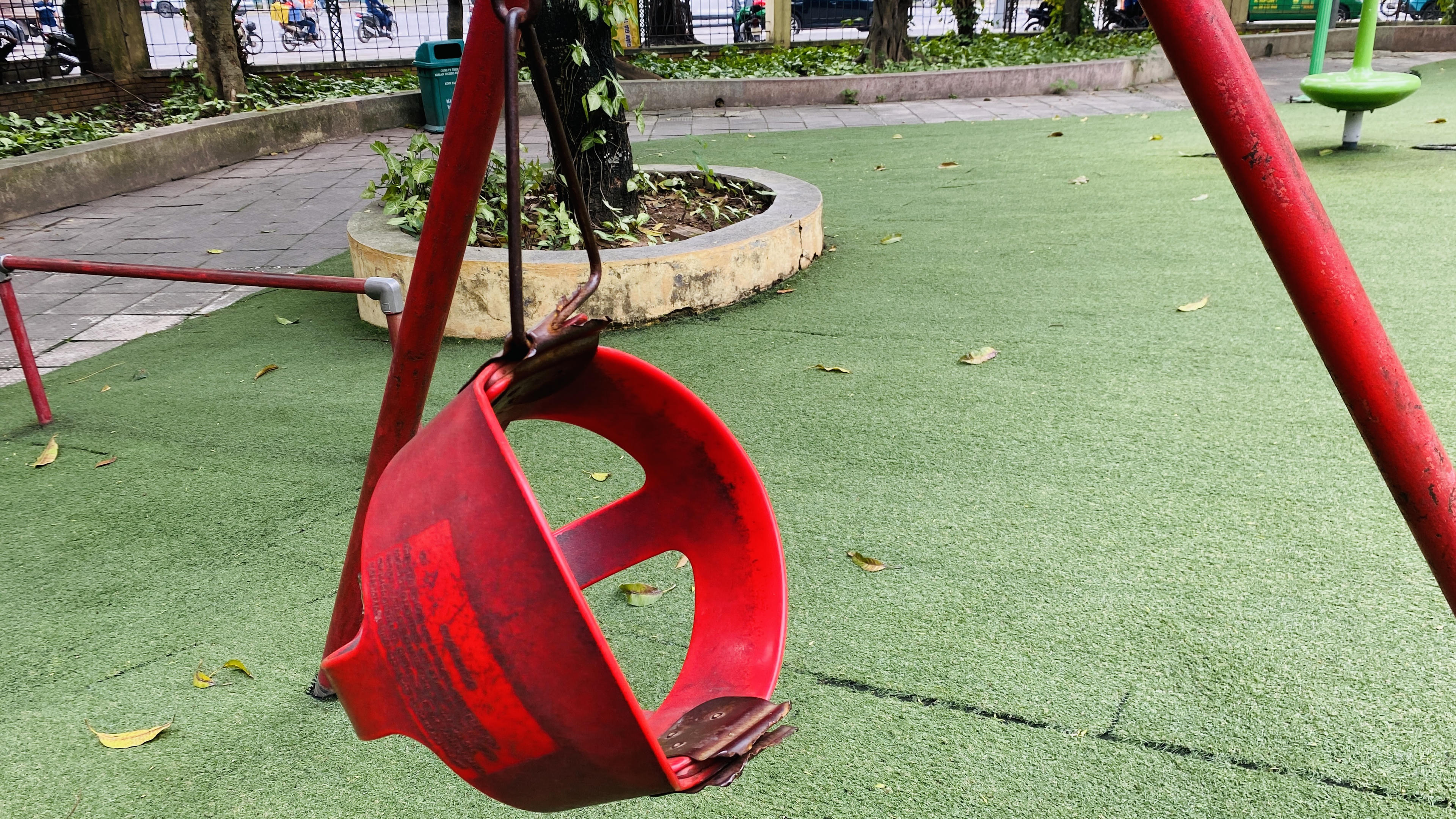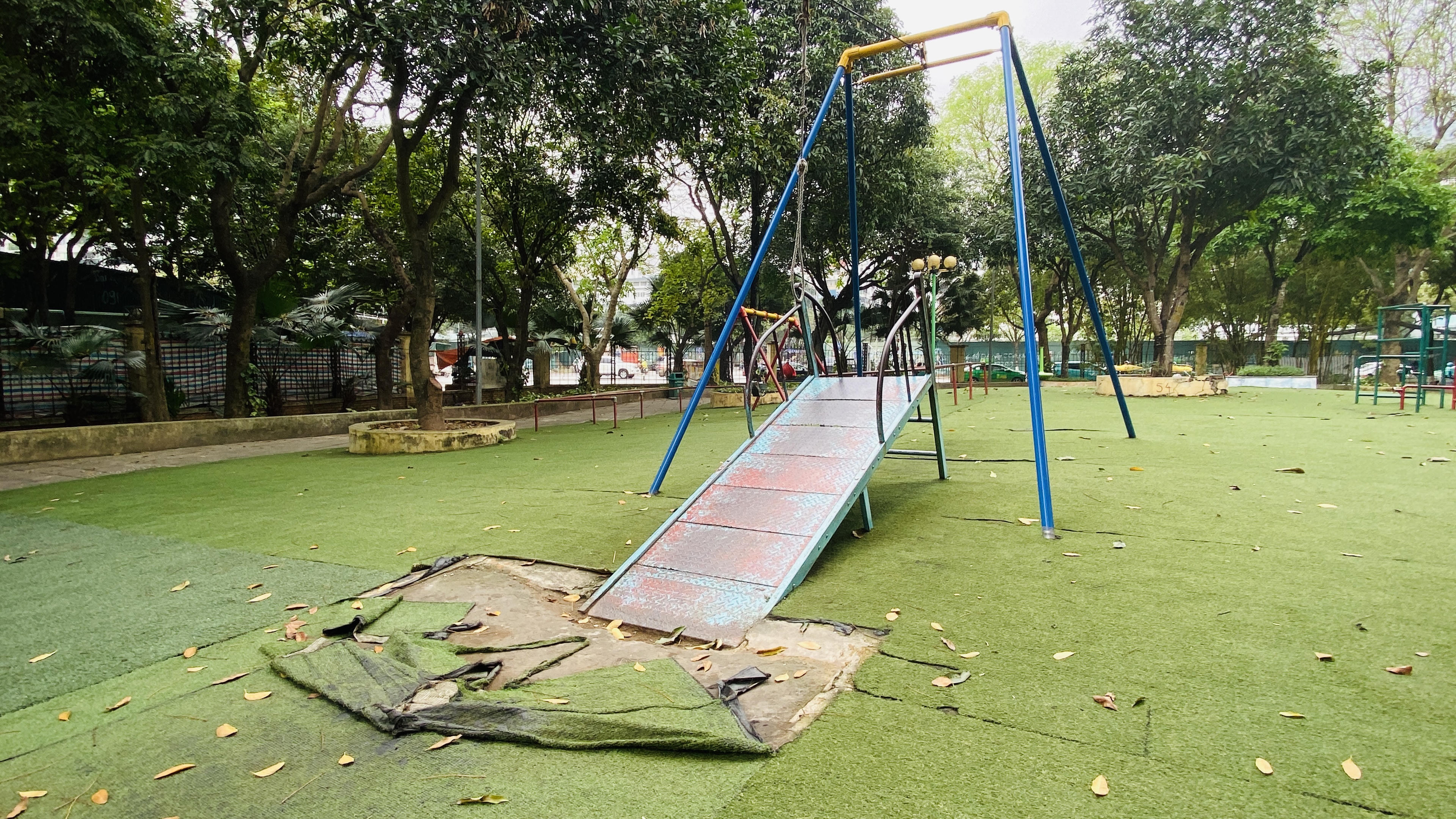 Thậm chí, những công trình vui chơi cho trẻ nhỏ cũng đã hỏng. Thảm cỏ nhân tạo ngày nào xanh mướt nay cũng đã trơ lớp xi măng, lộ rõ từng mảng bê tông lởm chởm dễ gây vấp ngã cho trẻ nhỏ. Xích đu cũng chiếc hỏng chiếc không dùng được...