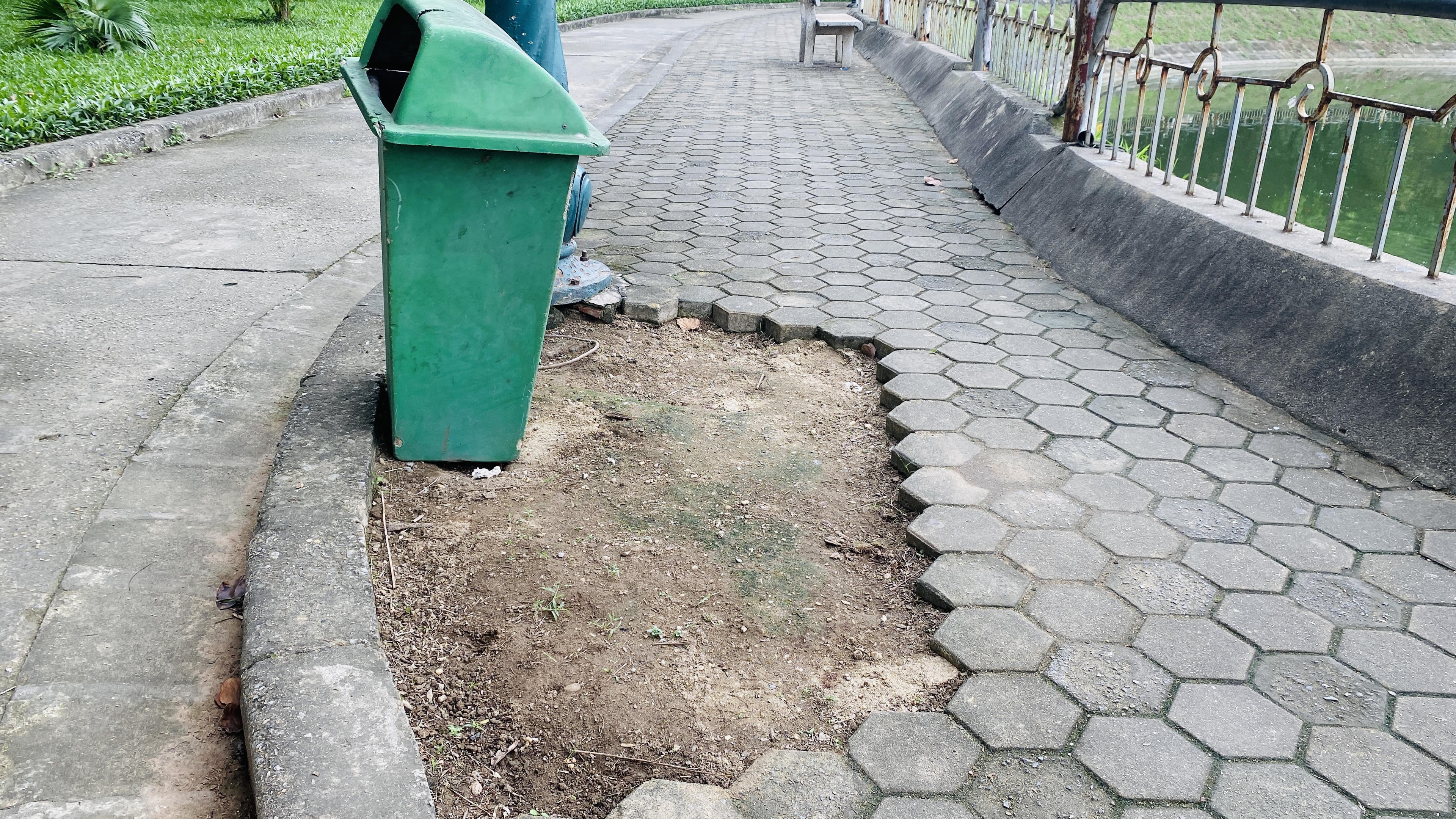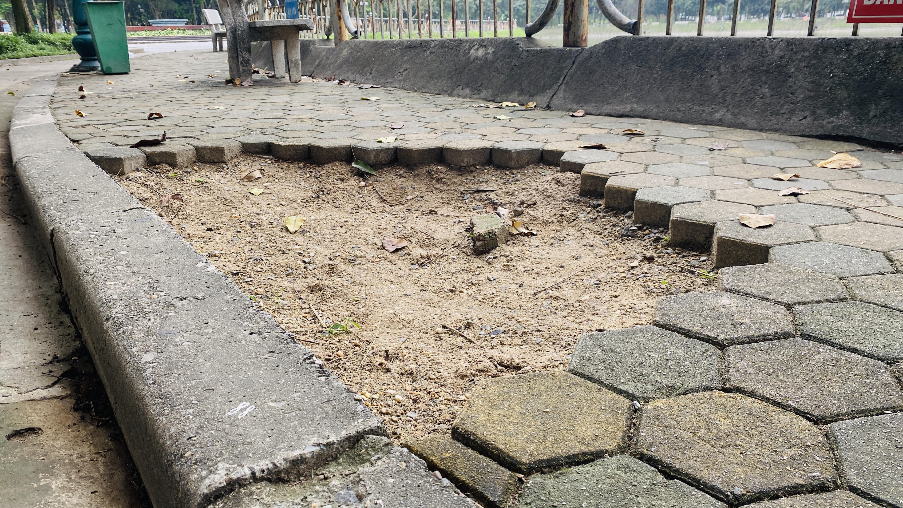 Ghi nhận của PV ngày 10/4, tại Công viên Cầu Giấy, có thể dễ dàng nhận thấy nhiều hạng mục của công viên đã hỏng hóc nhưng chưa được tu sửa. Những mảng gạch lát đã nứt vỡ, sụt lún, tạo thành những chiếc "bẫy" nguy hiểm cho người dân nếu không chú ý quan sát.