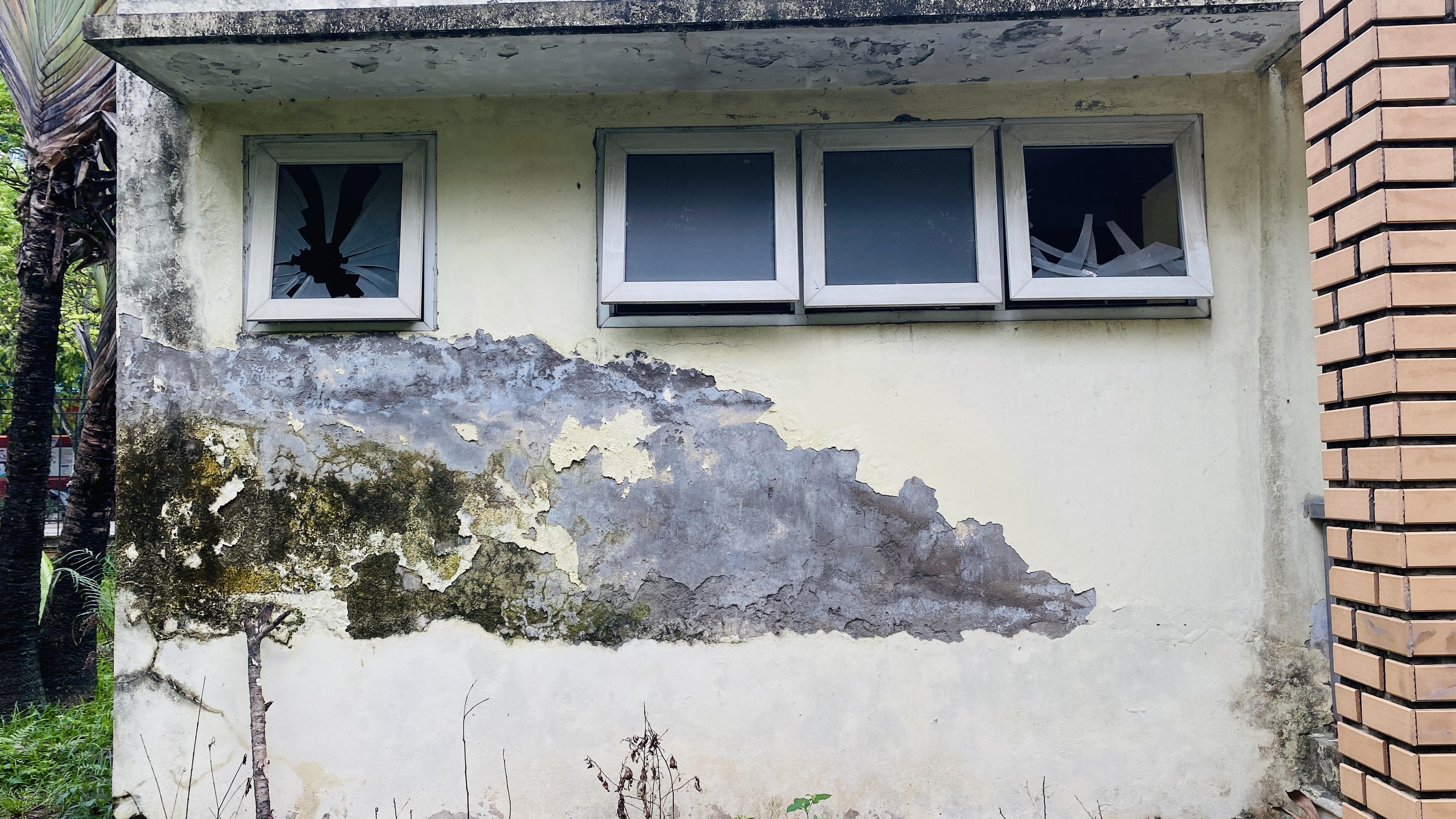 Bên ngoài một nhà vệ sinh, thấy rõ sự xuống cấp.