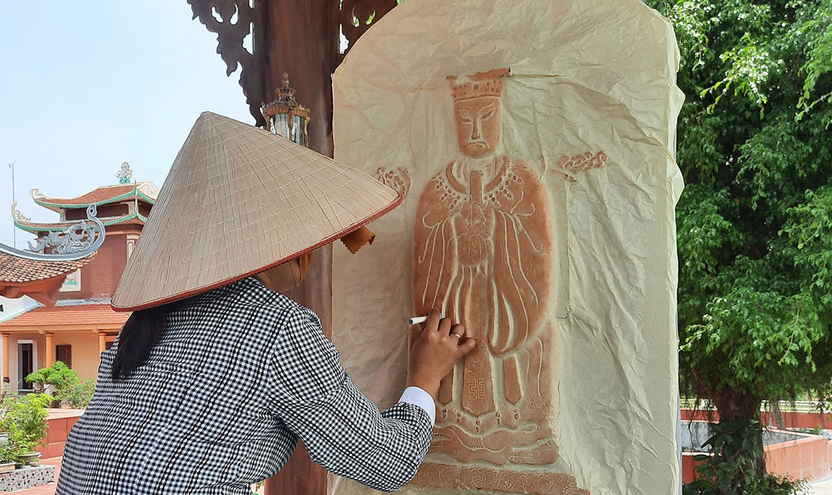 Cán bộ Bảo tàng Hà Nam thực hiện công tác rập hoa văn trên bia đá chùa Giàu. |