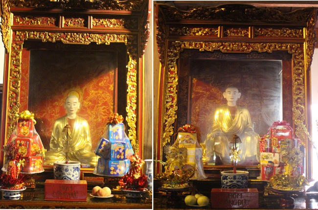 Tượng Pháp Loa - Đệ Nhị Tổ Trúc lâm (bên trái) và tượng Huyền Quang - Đệ Tam Tổ Trúc lâm (bên phải) được thờ tại chùa Phổ Minh vừa được Chính phủ công nhận là bảo vật quốc gia. (Ảnh: Mai Chiến) |