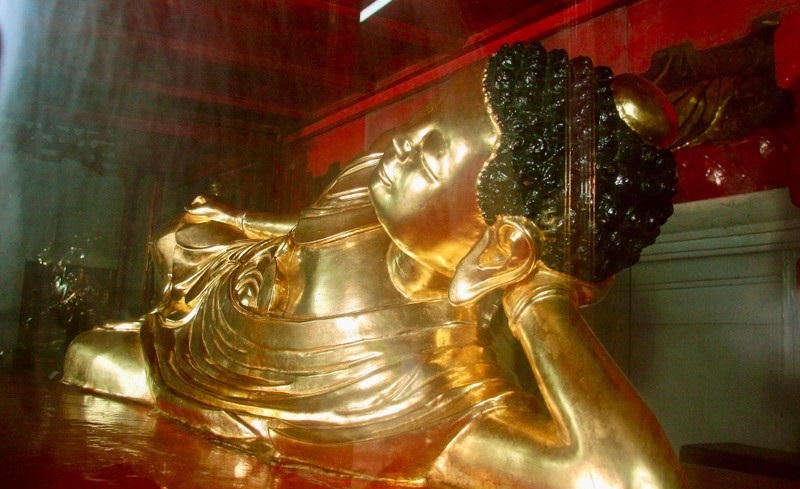 Tượng Phật hoàng Trần Nhân Tông nhập niết bàn với tư thế nằm nghiêng trong bộ tượng Trúc Lâm Tam Tổ được thờ tại chùa Phổ Minh. (Ảnh: Trần Khánh) |