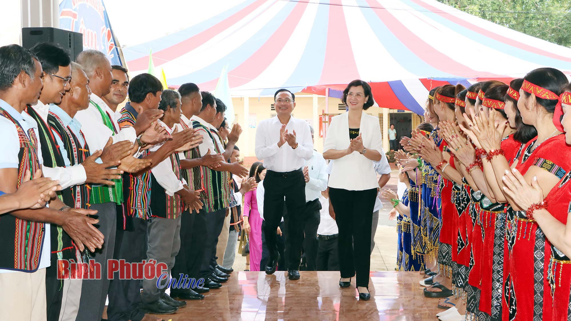 Bà Trần Tuyết Minh, Phó Chủ tịch UBND tỉnh cùng đại diện lãnh đạo các sở, ban, ngành của tỉnh, huyện Bù Đăng tham dự ngày hội đoàn kết dân tộc. (Ảnh: Báo Bình Phước) |