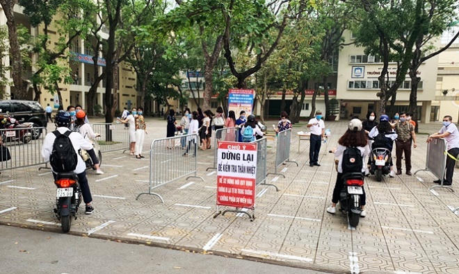 Tại Hà Nội, khoảng 700.000 học sinh THCS, THPT và giáo dục thường xuyên đi học trở lại từ hôm nay. Để bảo đảm giãn cách, giảm mật độ học sinh tập trung vào đầu giờ học, nhiều trường đã phân chia học sinh đi theo hai cổng để vào trường. Các giáo viên cũng được bố trí thành hàng dọc tại hai cổng, vừa để đo thân nhiệt cho học sinh, vừa yêu cầu học sinh sử dụng dung dịch sát khuẩn tay nhanh trước khi di chuyển vào khu vực sân trường.