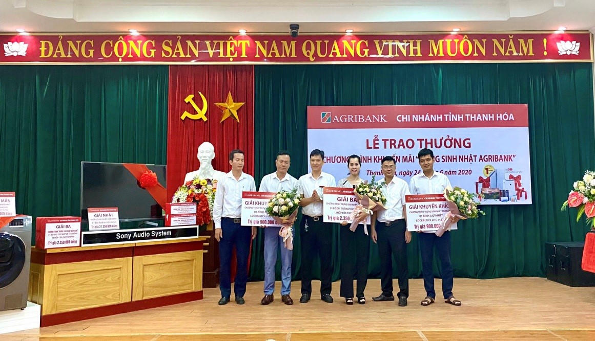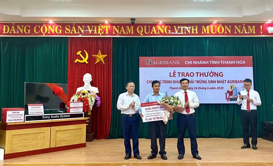 (PLVN) - Nhân dịp kỷ niệm 32 năm thành lập (26/3/1988- 26/3/2020), Ngân hàng nông Nghiệp và Phát triển Nông thôn Việt Nam chi nhánh Thanh Hóa (Agribank Thanh Hóa) đã tổ chức Lễ trao giải chương trình khuyến mại mại “Mừng sinh nhật Agribank”.
